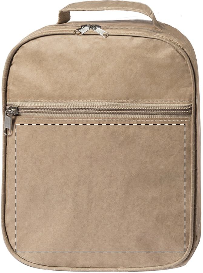 Borsa frigo in carta riciclata laminata con cerniera, imbottitura in alluminio e tasca frontale.