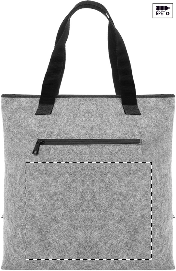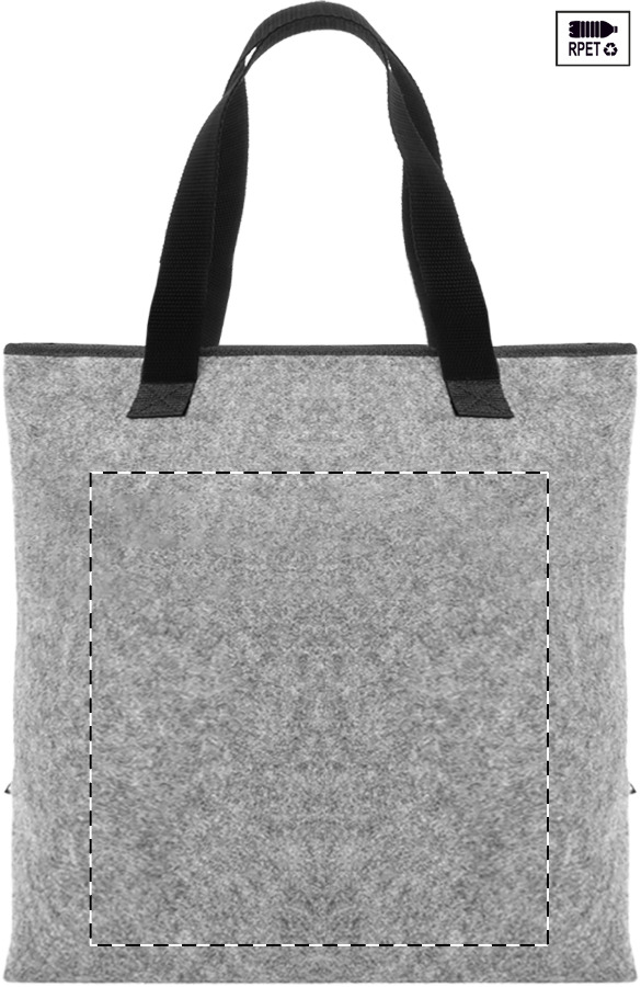 Borsa shopper termica in feltro RPET con imbottitura in alluminio, chiusura a velcro, tasca frontale con cerniera, manici lunghi ed etichetta RPET.