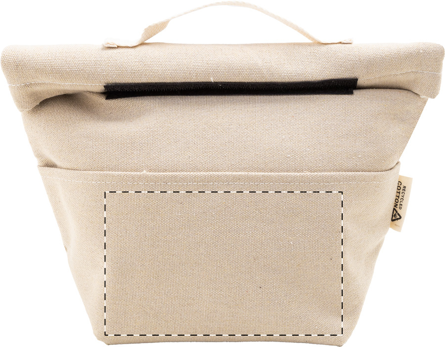 Borsa termica rolltop in tela composta da 70% cotone riciclato e 30% poliestere RPET, con tasca frontale, imbottitura in alluminio, chiusura in velcro ed etichetta cotone riciclato.