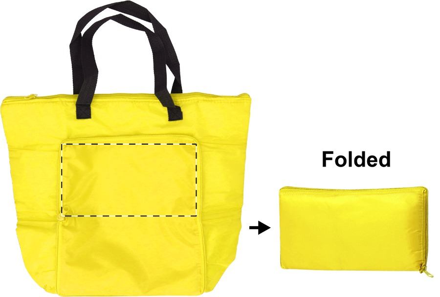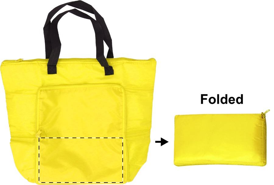Borsa frigo pieghevole in nylon con cerniera, manici lunghi e imbottitura in alluminio.