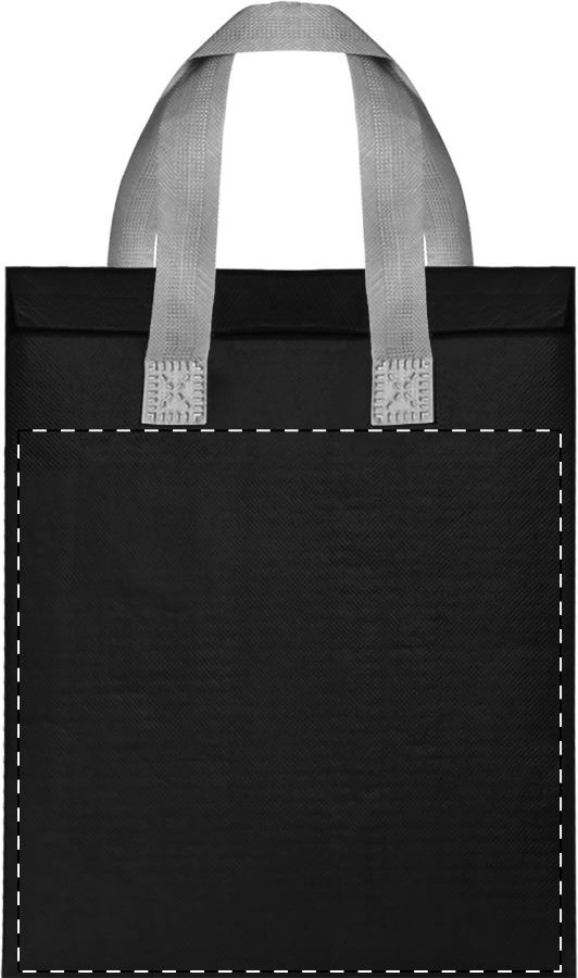 Borsa termica in tessuto non tessuto laminato con manici, chiusura a velcro e imbottitura in alluminio.
