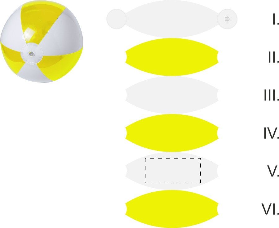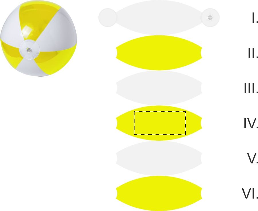 Pallone da spiaggia 6 pannelli bianchi e colorati trasparenti in PVC. Dimensione sgonfiato: 370 mm.