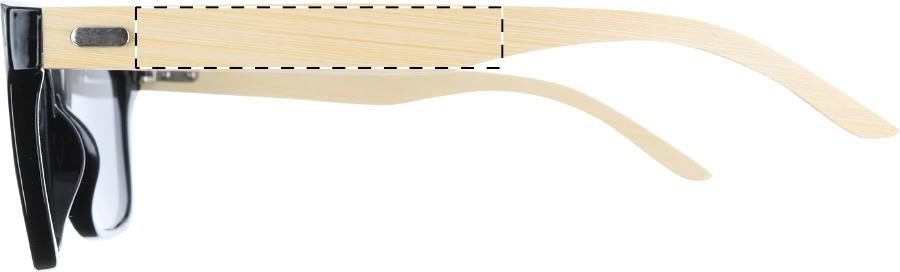 Occhiali da sole in plastica con aste in bambù e lenti metallizzate. Con protezione UV 400.
