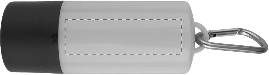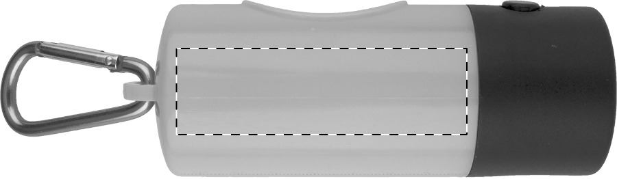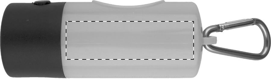 Distributore in plastica di sacchetti per deiezioni canine con 1 luce LED, 15 sacchetti e moschettone in alluminio. Batteria a bottone fornita.