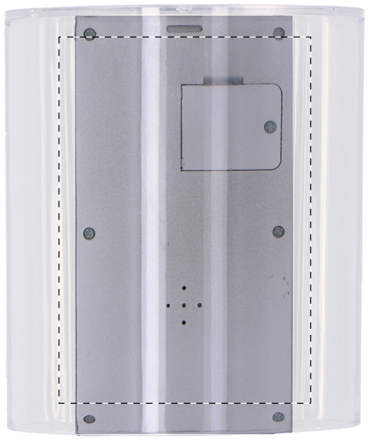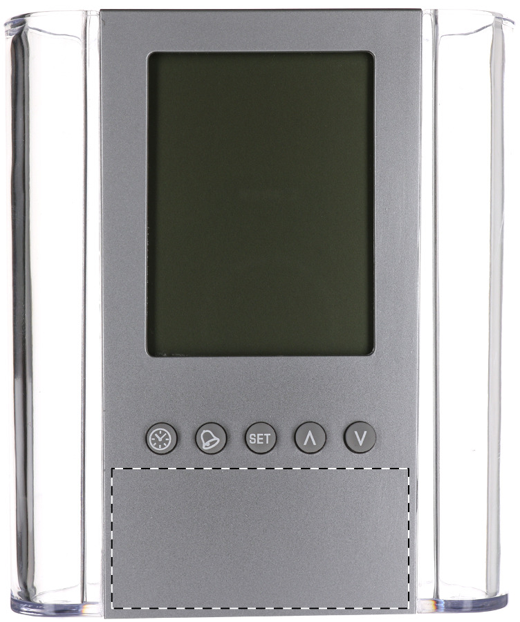 Portapenne in plastica trasparente con display digitale, termometro, orologio, sveglia e calendario. Consegnato con batteria a bottone.