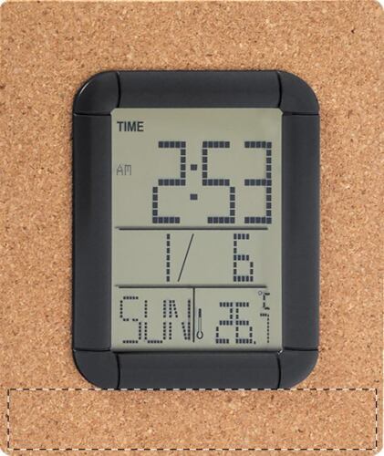 Portapenne in sughero naturale con display digitale, termometro, orologio, sveglia e calendario. Con batteria a bottone.