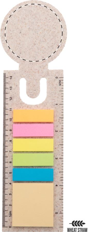 Segnalibro e righello in plastica ecologica in paglia di grano con 25 foglietti adesivi e 125 segnapagina (in 5 colori diversi).