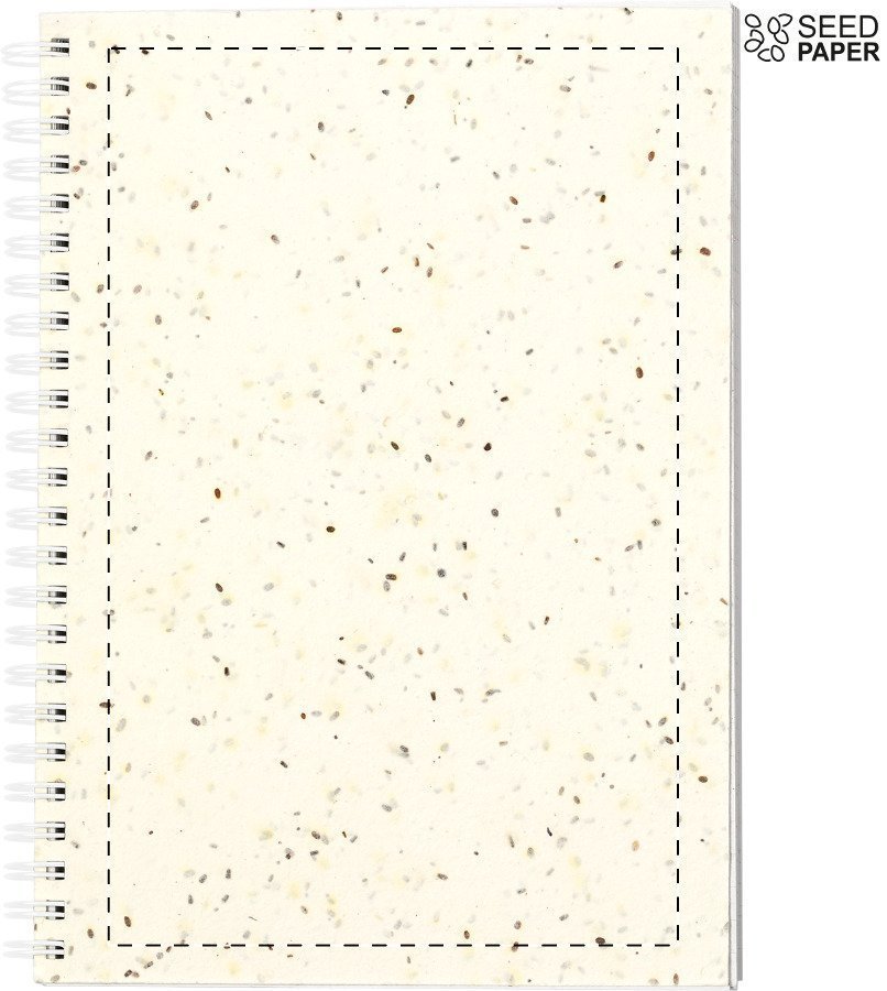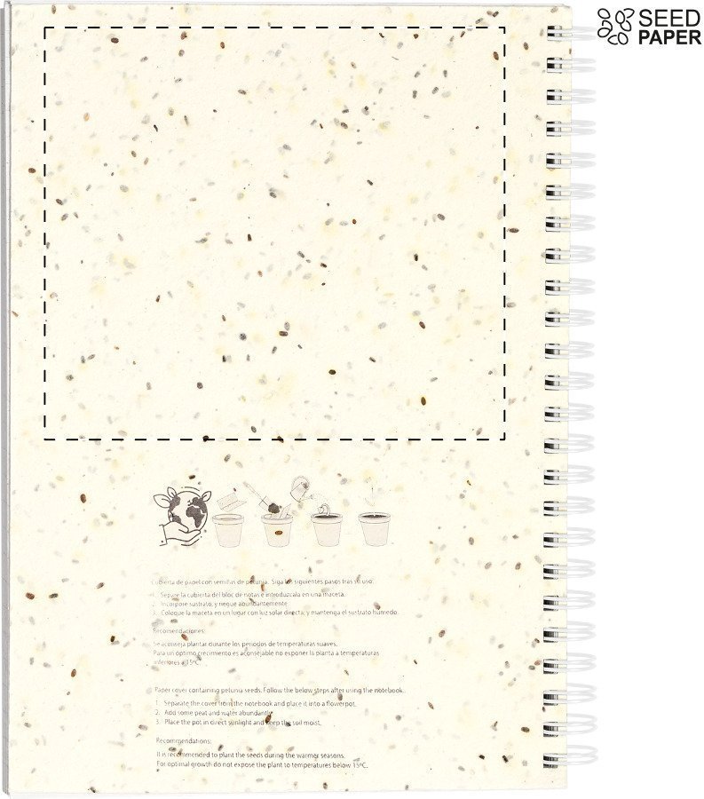 Quaderno a spirale formato A5, con copertina in carta di semi con 80 pagine. La copertina in carta di semi contiene semi di petunia in colori assortiti, che possono essere piantati separando la copertina dai fogli e dalla spirale.