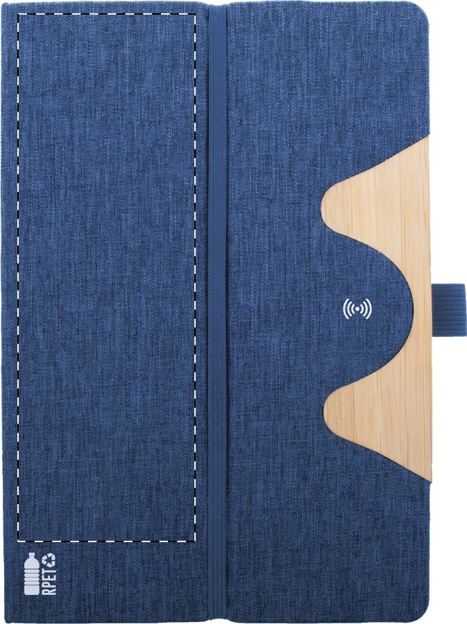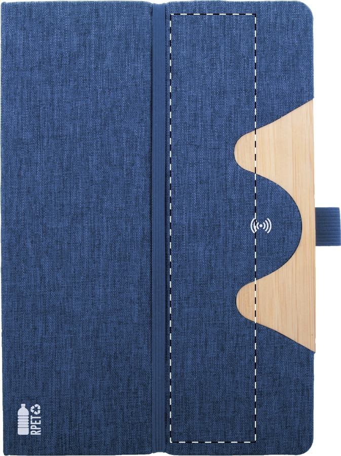 Quaderno formato A5, con 80 pagine a righe in carta riciclata, copertina in poliestere RPET ed inserto in bambù, portacellulare, caricatore rapido wireless integrato (15W) e cavo di ricarica USB.