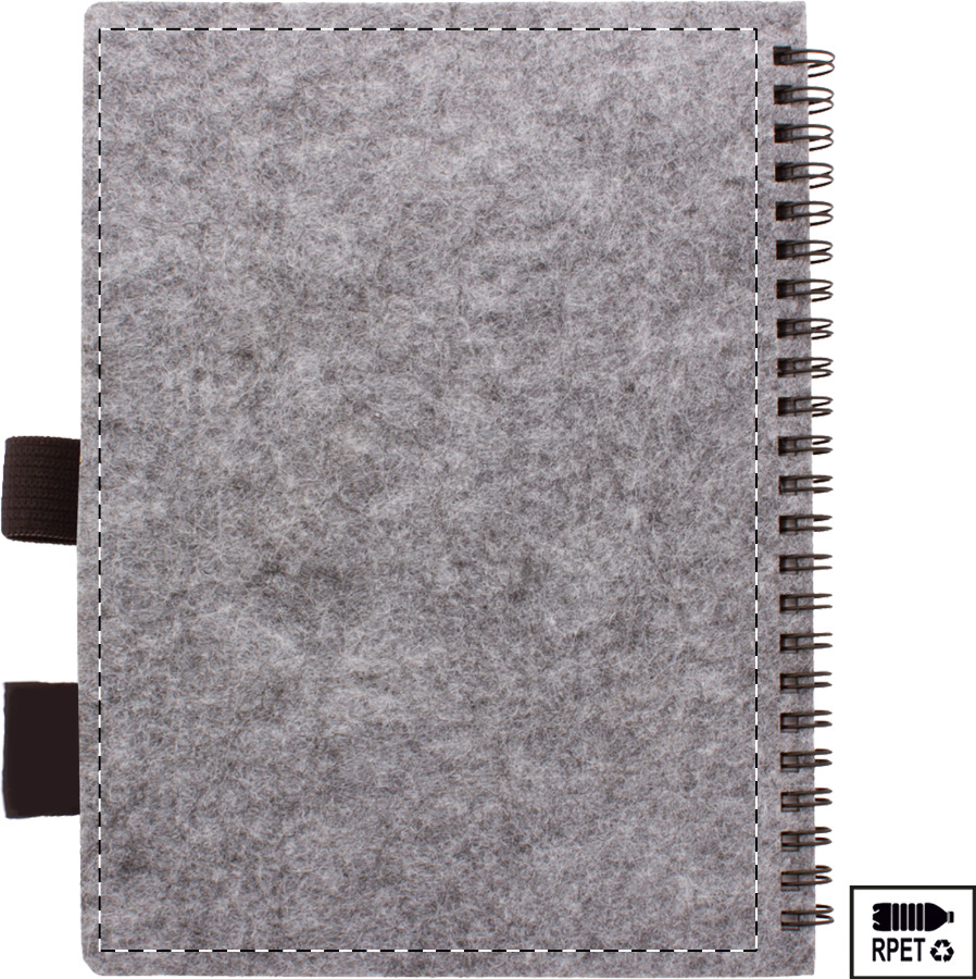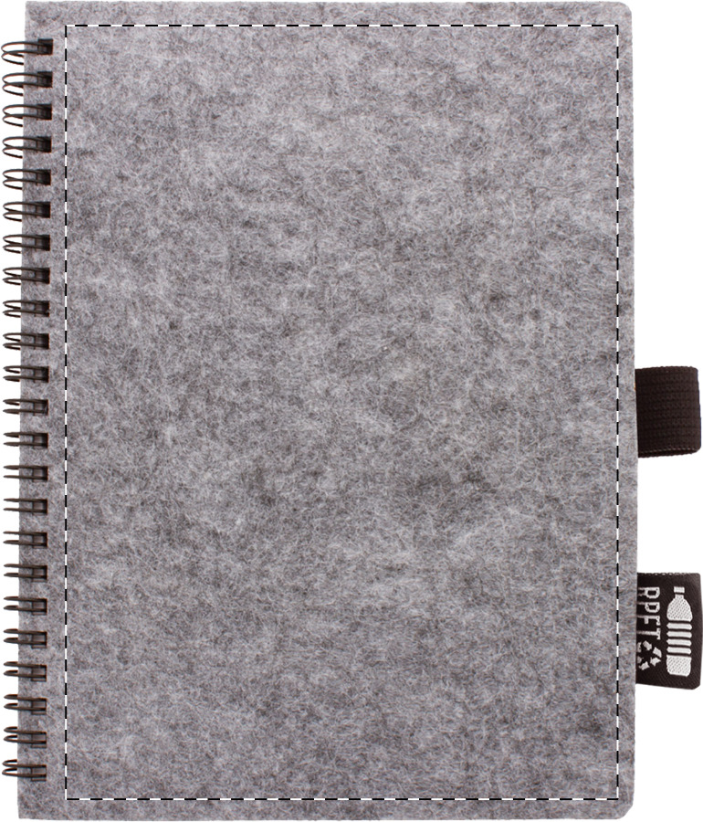 Quaderno a spirale formato A6, con copertina in feltro RPET, 80 fogli a righe in carta riciclata ed etichetta RPET.