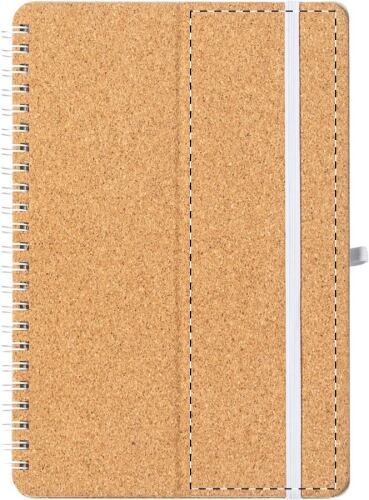 Quaderno a spirale formato A5 con copertina in sughero naturale, portacellulare e supporto da tavolo in plastica ecologia in paglia di grano. Con 70 fogli a righe e cinturino in gomma.