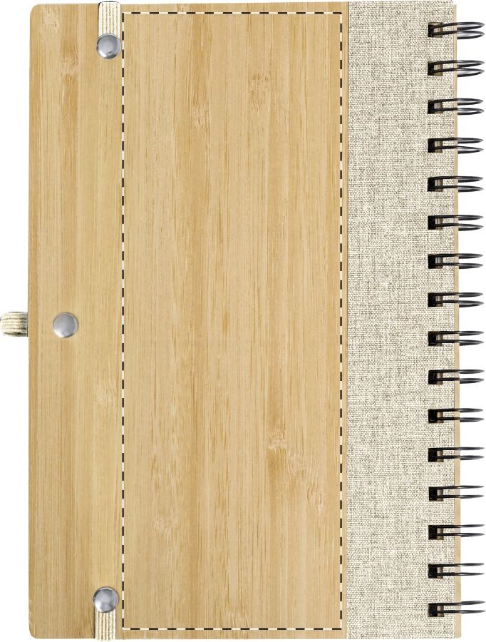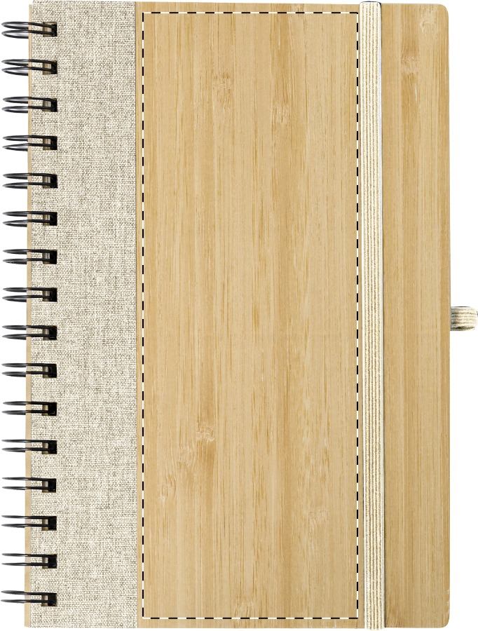 Quaderno a spirale formato A5, con 80 pagine a righe in carta kraft riciclata, copertina in bambù e poliestere RPET, elastico in gomma e porta penna.