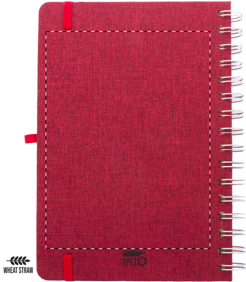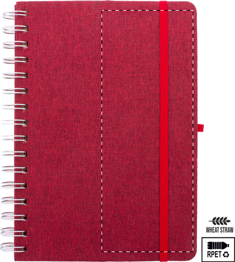 Quaderno a spirale formato A5, con copertina in poliestere RPET, 70 fogli a righe in carta kraft riciclata, occhiello portapenne, inserto in plastica di paglia di grano per cellulare e tablet ed elastico di chiusura.