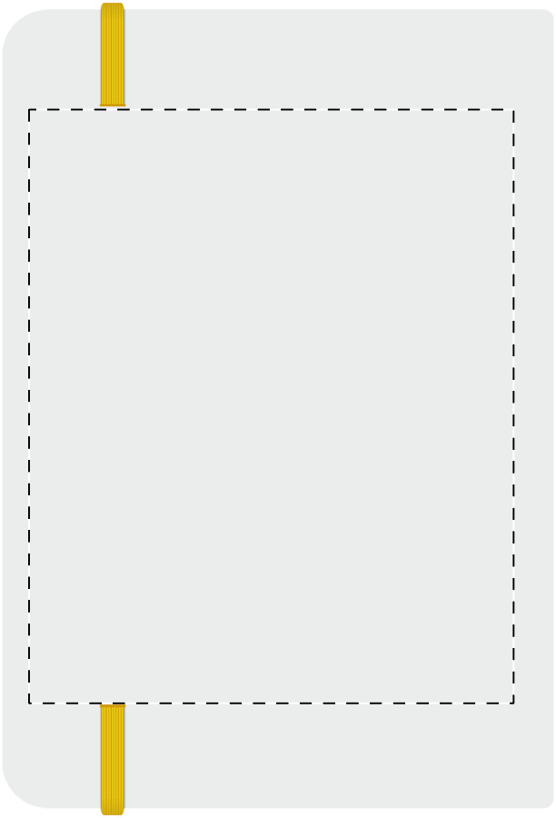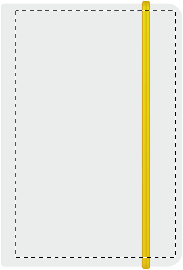 Quaderno formato A5 con copertina in cartoncino bianco e 100 fogli bianchi, costa del quaderno e cinturino in gomma in colore coordinato.