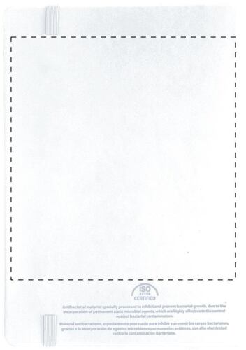 Quaderno rivestito in pelle PU antibatterica con segnalibro e cinturino in gomma. Con 100 fogli bianchi. Misura A5. Conforme alla norma ISO 22196.