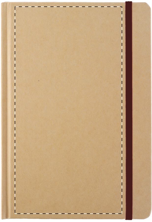 Quaderno in carta riciclata con copertina rigida, 100 fogli bianchi, segnalibro in colore naturale ed elastico in gomma. Formato A5.