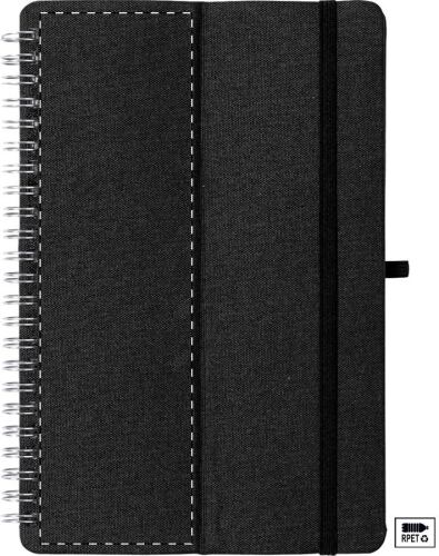 Quaderno a spirale formato A5 con copertina in poliestere 600D RPET, inserto in plastica paglia di grano e supporto da tavolo. Con 70 fogli a righe e cinturino in gomma.