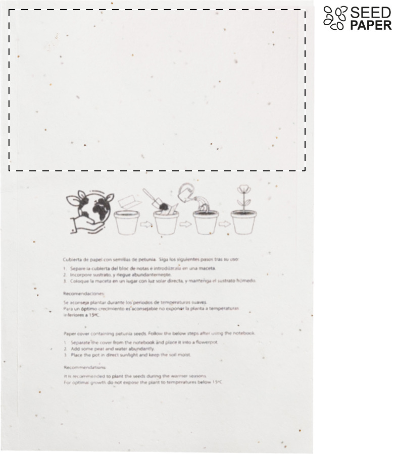 Quaderno formato A5 in carta di semi con copertina in carta kraft riciclata e 60 fogli bianchi. La copertina contiene semi di petunia in colori assortiti, che possono essere piantati separando la copertina dal quaderno.