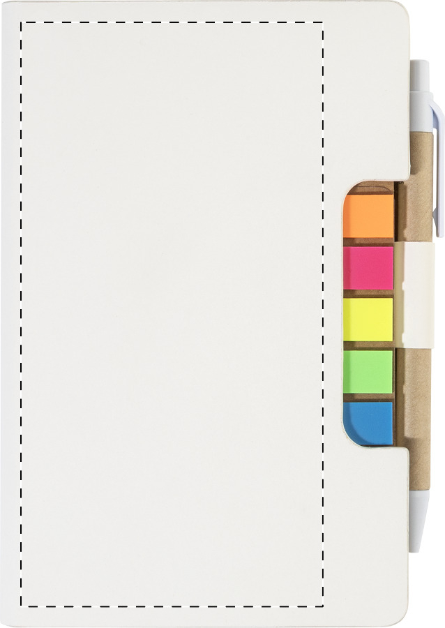 Quaderno con copertina in pelle PU riciclata, 70 fogli a righe in carta riciclata, 125 segna pagine (in 5 colori diversi) e penna a sfera in PP riciclato con refill blu.