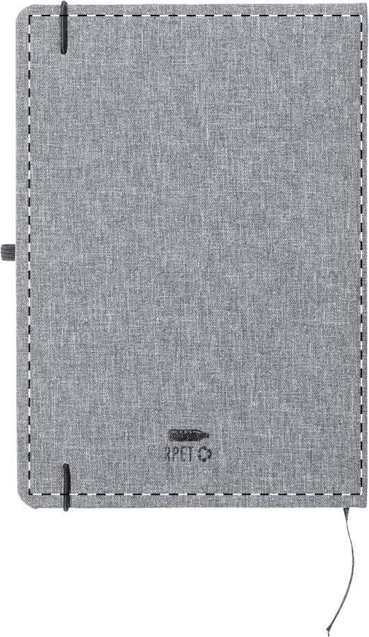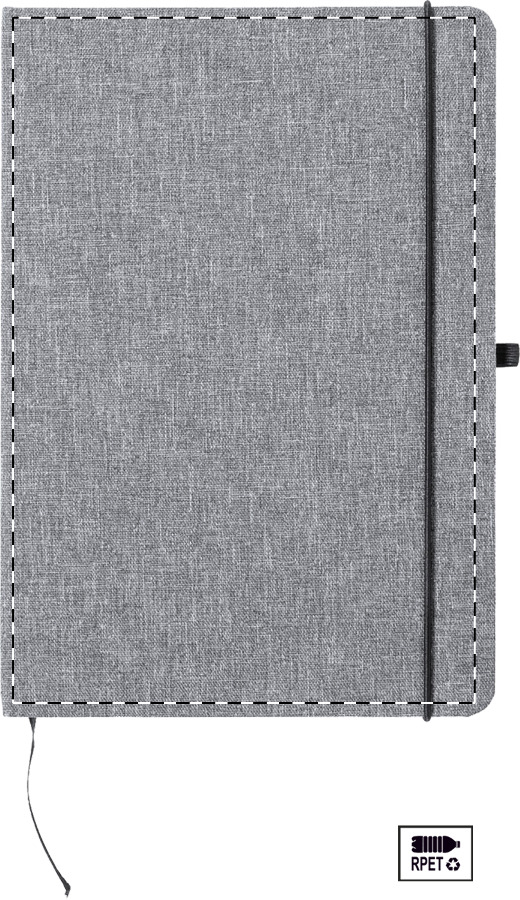 Quaderno formato A5 con copertina in poliestere 600D RPET e 100 fogli a righe, segnalibro ed elastico in gomma.