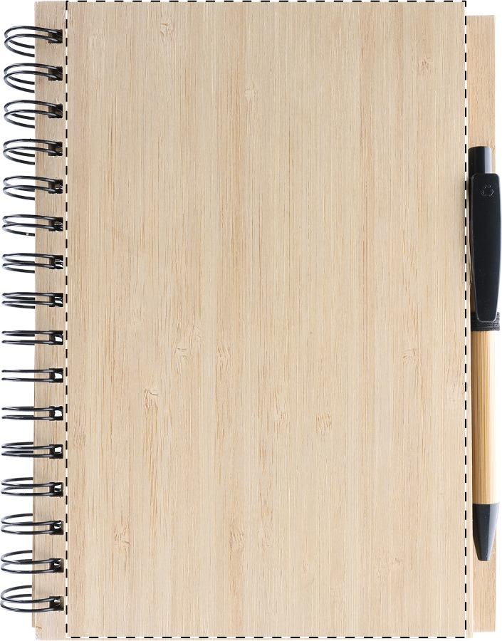 Quaderno a spirale con copertina in bambù. Penna a sfera in bambù con refill nero compresa. 80 fogli a righe, formato A5.