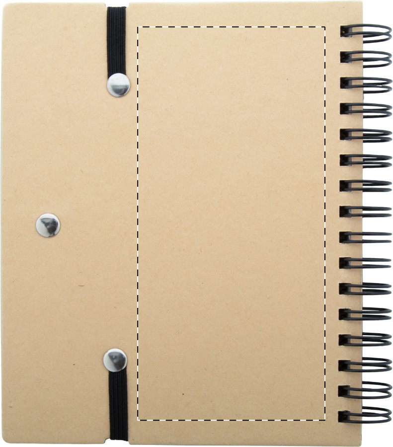 Quaderno a spirale formato A6, in carta riciclata con 70 fogli a righe e 125 segnapagina (in 5 colori diversi), elastico e portapenne. Inclusa penna a sfera in carta riciclata con refill blu.
