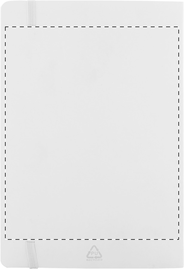 Quaderno nel formato A5 in pelle PU riciclata, copertina morbida con 80 fogli in carta riciclata a righe, segnalibro ed elastico in colore coordinato.