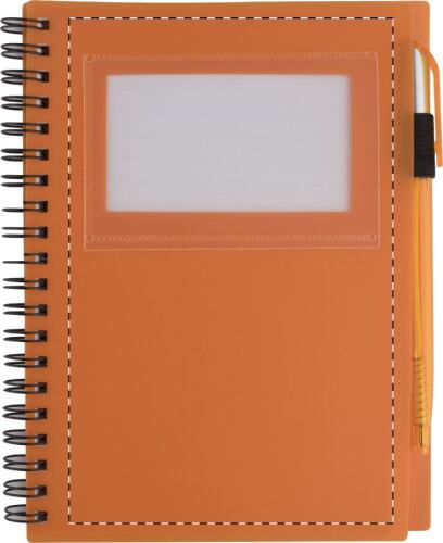 Quaderno con copertina di plastica (PP), 70 pagine e una penna a sfera in plastica con inchiostro blu.