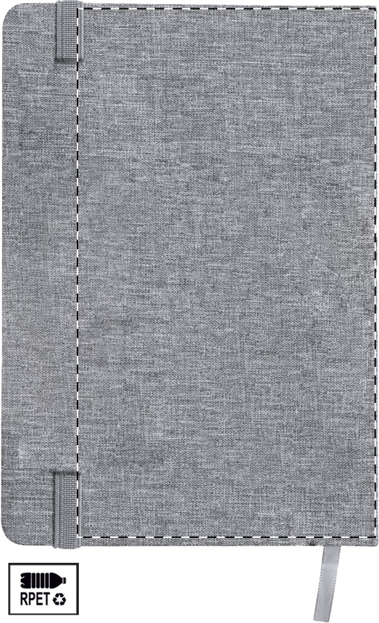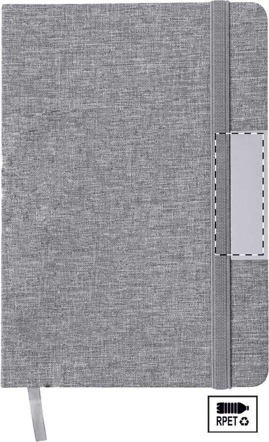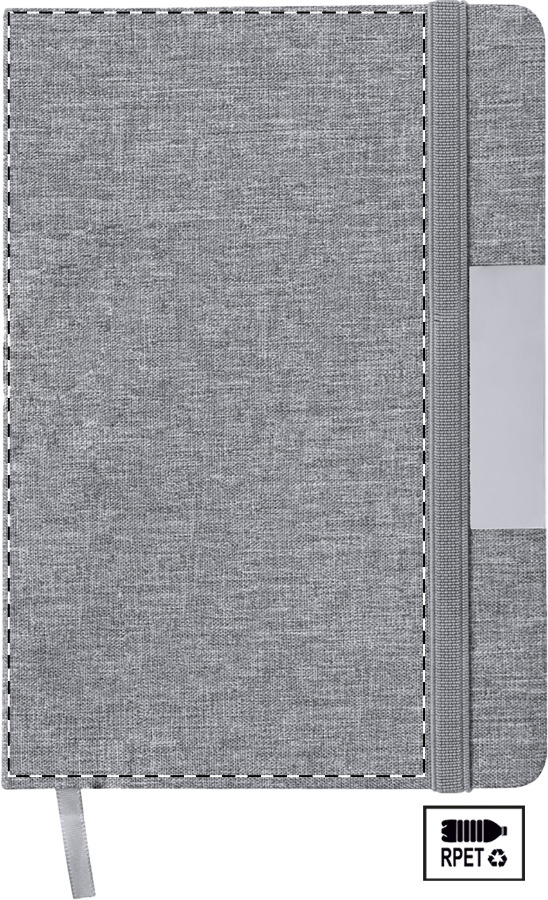 Quaderno formato A5 con copertina in poliestere 300D RPET, 100 fogli a righe, elastico di chiusura in gomma, penna a sfera in metallo con rivestimento in poliestere RPET e refill blu.