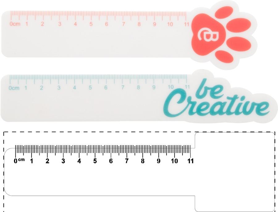 Righello in plastica (11 cm) con parte superiore sagomata su misura (dimensioni massime: 50x50 mm). Il prezzo include la stampa a 1 colore. MOQ: 100 pz.