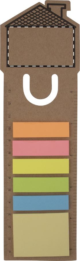 Segnalibro in carta a forma di casa con righello e con note adesive.