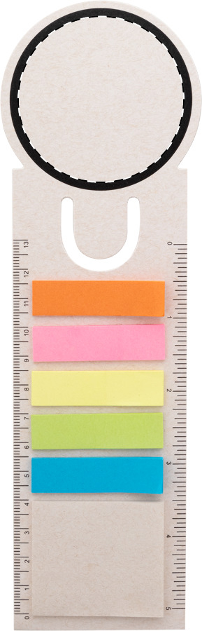 Segnalibro e righello in carta riciclata di cartone del latte con 15 foglietti adesivi e 75 segnapagina (in 5 colori diversi).