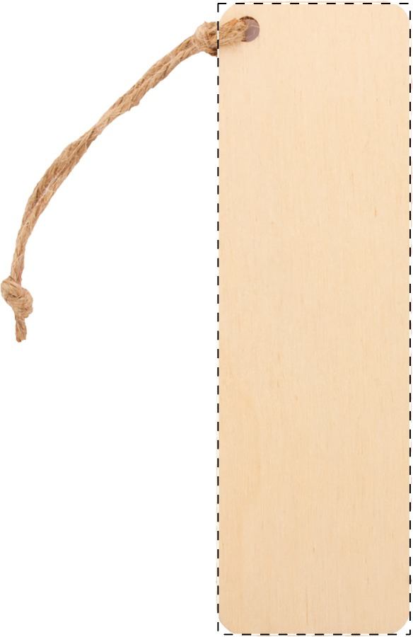Segnalibro in compensato di betulla personalizzabile con grafica a colori e cordoncino in lino. Il costo comprende la stampa UV LED sul lato anteriore. MOQ: 100 pezzi.