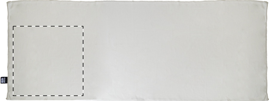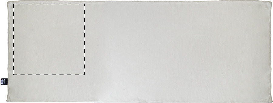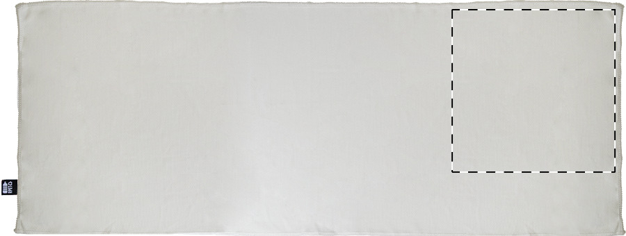 Asciugamano sportivo in microfibra RPET contenuto in un sacchetto di tessuto non tessuto RPET ed etichetta RPET. Poliestere RPET, 140 g/m².