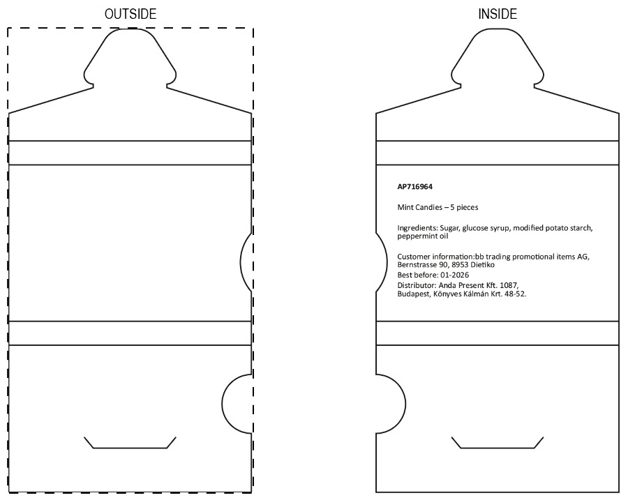 Blister con 5 caramelle alla menta di grandi dimensioni, con confezione in cartoncino stampato a colori. MOQ: 100 pezzi.