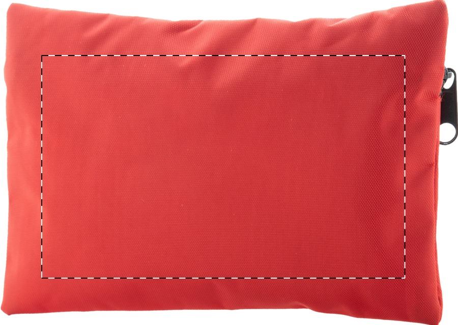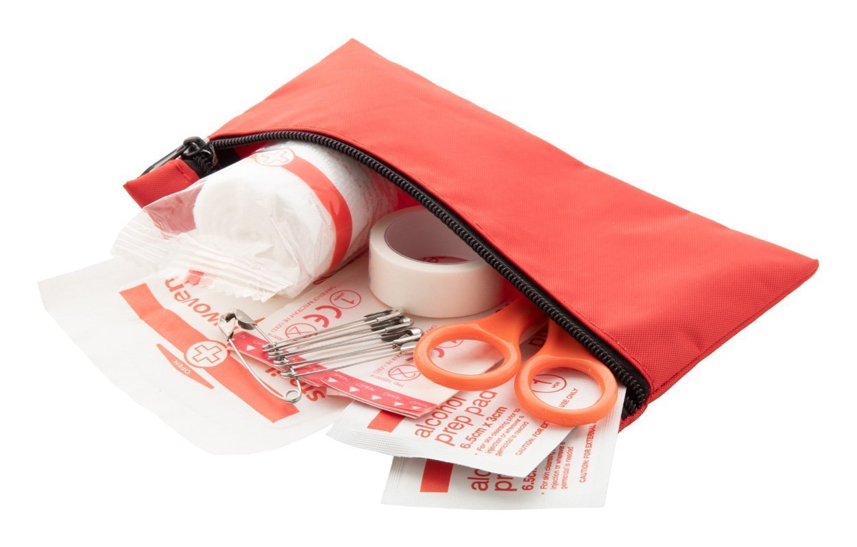 Kit compatto di pronto soccorso in astuccio di nylon con zip. Composto da forbici, 1 bendaggio elastico, 4 salviette disinfettanti, 1 garza sterile, 5 cerotti, 5 spille di sicurezza e nastro per medicazione.