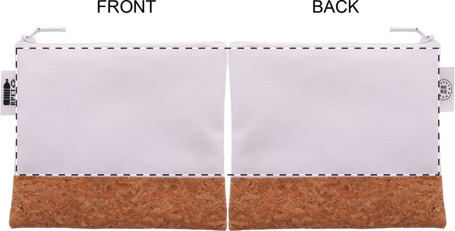 Trousse per cosmetici in poliestere 600D RPET e sughero, personalizzabile con grafica stampata in sublimazione su tutta la superficie e cerniera. MOQ: 50pz.