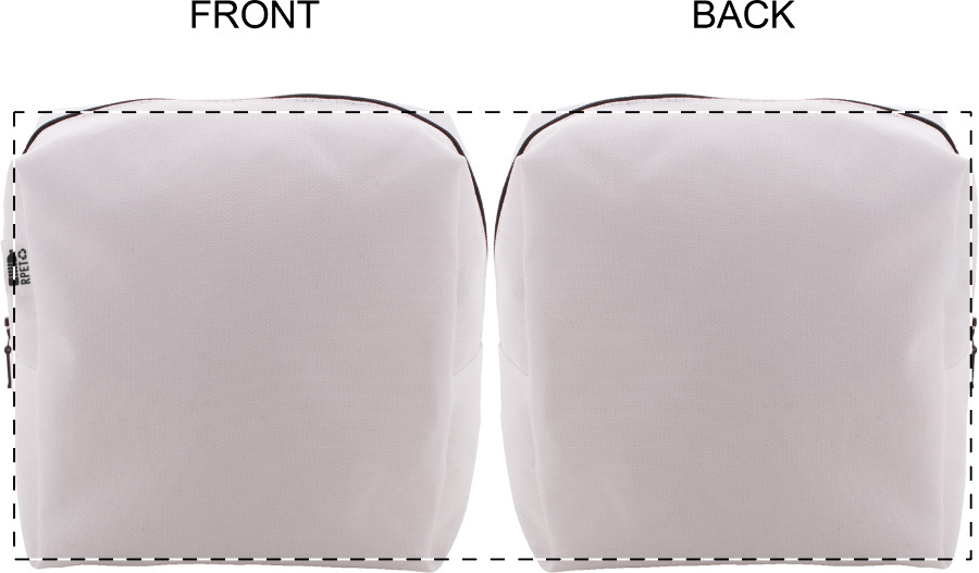 Trousse per cosmetici quadrata in poliestere 600D RPET con stampa in sublimazione su tutta la superficie e zip. MOQ: 50pz.