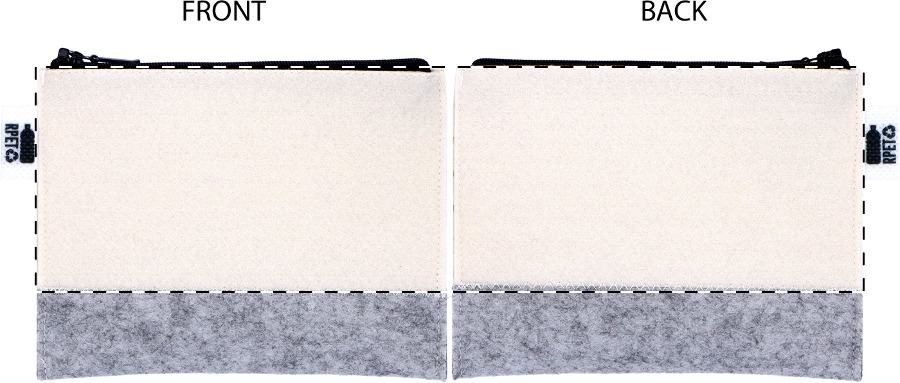 Trousse per cosmetici in feltro RPET con grafica stampata in sublimazione su tutta la superficie, cerniera ed etichetta RPET. MOQ: 50 pezzi.