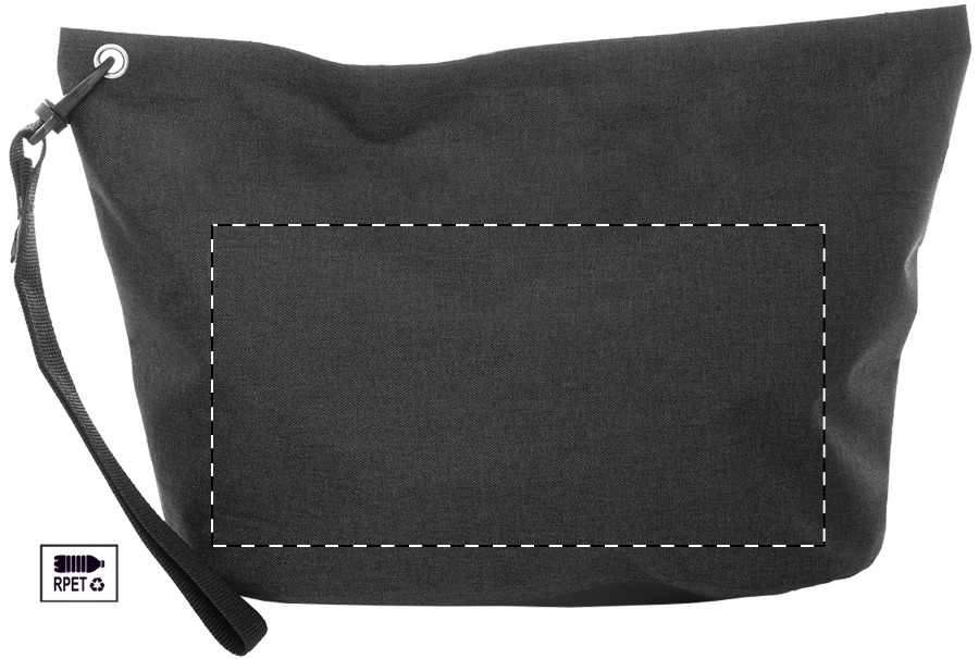 Trousse impermeabile in poliestere 300D RPET per cosmetici, con cerniera, cinturino con moschettone ed etichetta RPET.