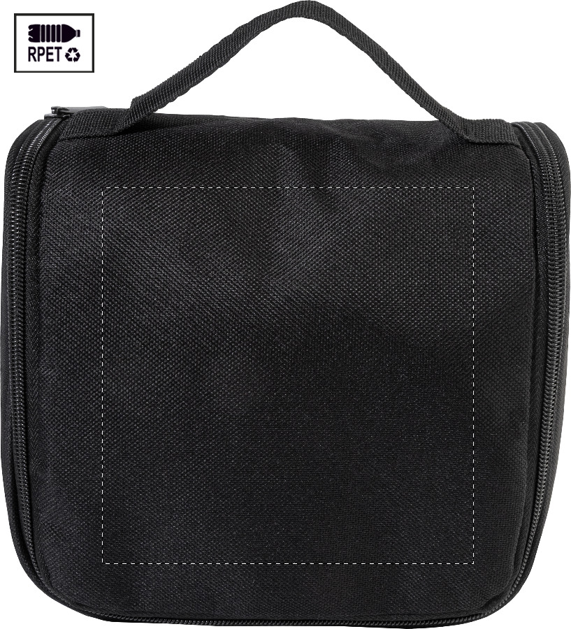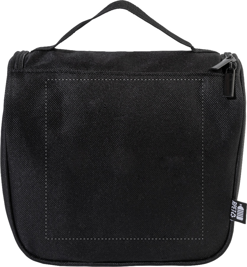 Beauty per cosmetici in poliestere 600D RPET con scomparti interni chiusi con zip, tasche in rete ed etichetta RPET.